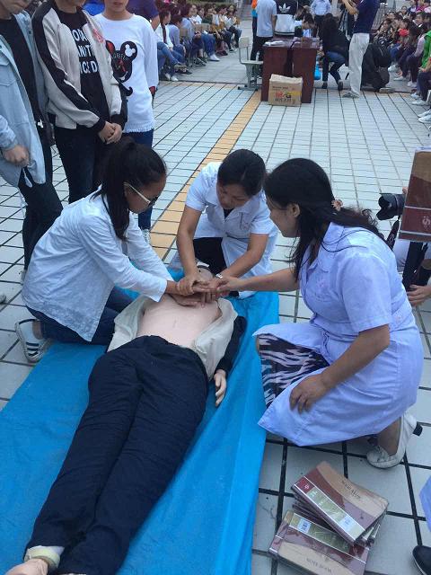 培训活动中的现场操作互动环节将活动推向高潮。同学们竞相体验模拟操作,医务人员“一对一”进行操作要领指导,通过实践,同学们对心肺复苏有了直观的认识,对白衣天使救死扶伤的神圣职责有了更深的领悟。