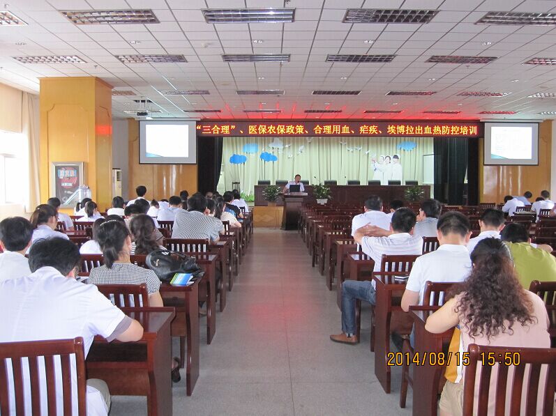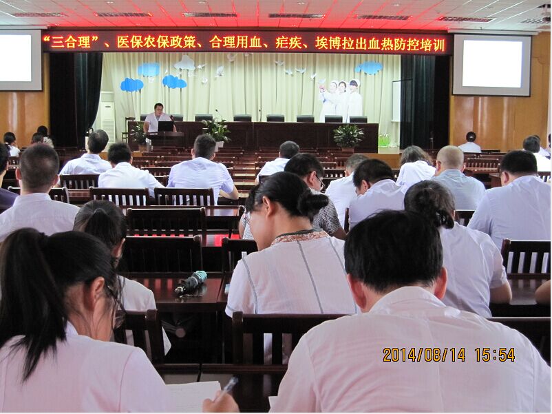 2014年8月14日及15日下午,我院医务部联合医保农保办公室、感染科、输血科在门诊十楼大会议室开展了有关“三合理”标准解析、新农合政策、疟疾的诊断与治疗、埃博拉出血热的防治以及科学与合理用血等相关培训。全体临床医师参加了此次培训。