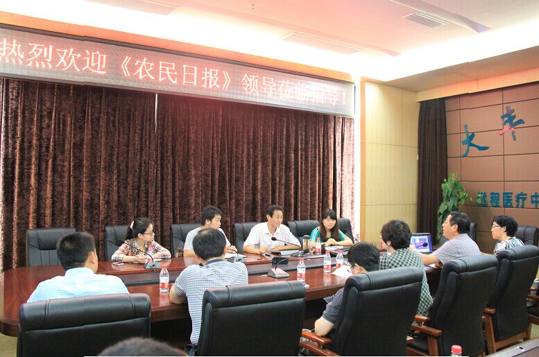 采访团一行在院领导陪同下参观了我院,对我院优美的院内环境、优质的人性化服务给与了高度评价,尤其对门诊自动发药机、自动叫号系统、基于居民健康档案的区域卫生平台等表示浓厚的兴趣。参观结束后,在我院门诊十楼会议室召开了座谈会。陈俊副院长代表全院职工对《农民日报》报社一行表示热烈欢迎,感谢《农民日报》对我院的关注。他首先向来宾介绍了医院的发展历程,接下来介绍了我院减轻病患者负担的措施和做法,一是增加医院硬件投入,简化就医流程,缩短病人就诊等候时间;二是加强内部管理,提高医务人员的服务水平;三是规范服务行为,提高病患者的满意度。同时陈院长介绍了近来全院职工锐意改革、真抓实干,以优异的成绩通过了“二甲”医院复审;公立医院改革成效显著,高新区分院项目建设如火如荼,合理用药监督有力,药品零差价实施到位,远程会诊彰显特色,最后,陈院长就医院特色发展与采访团进行了深入有效的交流。