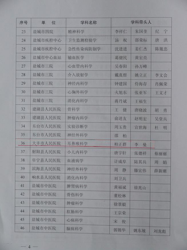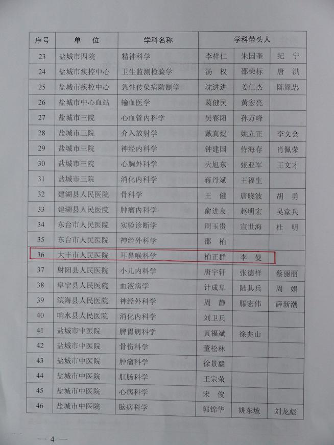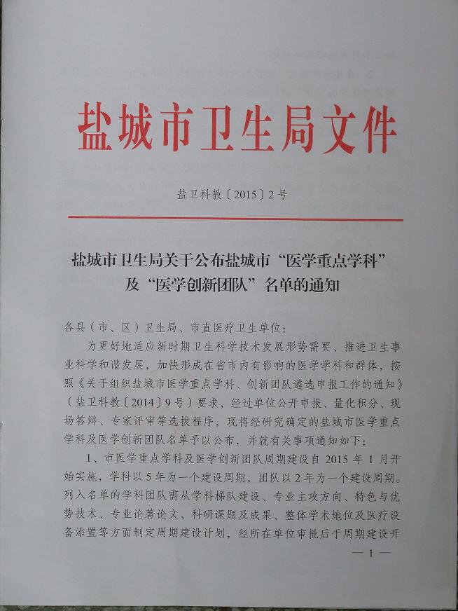 我院耳鼻咽喉科被确认为盐城市重点学科