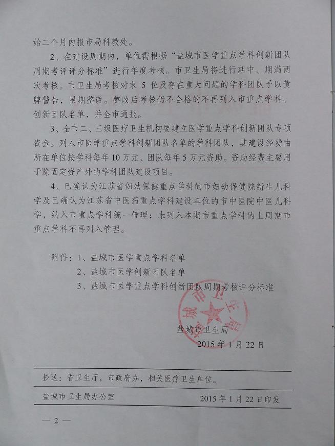 经过单位公开申报、量化积分、现场答辩、专家评审等选拔程序,我院耳鼻咽喉科被确认为盐城市重点学科,3月31日在盐城市卫生局举行了隆重的命名和授牌仪式。盐城市重点学科是在本专业医、教、研列盐城市领先地位的科室,是盐城市同专业中的标杆科室,五年为一个建设、考核周期。我院耳鼻咽喉科2006年被确认为盐城市重点专科,现又被确认为盐城市重点学科,是盐城市为数不多的双重点科室。
