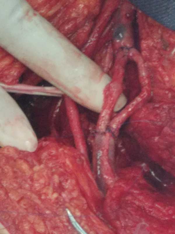 事故发生当天,患者因玻璃门砸伤被120送至我院抢救,当时患者的情况非常危急,玻璃砸断右大腿股静脉,失血过多陷入浅昏迷状态,已测不到血压,伤情十分严重。此时,时间就是生命。我院立即成立抢救小组,急诊科、骨科、手术室等多科室快速联动,立即将病人转移至手术室,已经准备就绪的手术室医护人员立即投入到抢救工作中,为患者争取了最佳抢救时机。术中,阻断股动脉,探查发现股静脉分离约5cm,无法直接吻合,遂取同侧大隐静脉行自体静脉移植术,在松开止血带的刹那,患肢颜色转为粉红,肢端由湿冷变为温暖,患者血压恢复,生命体征平稳,手术取得成功。整台手术下来,医护人员争分夺秒、临危不乱,为患者的生命保驾护航、全力以赴。