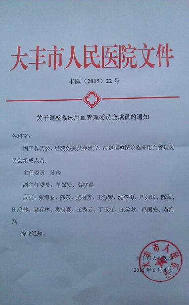 会议首先由医务部单主任宣读委员会成员调整文件(丰医【2015】22号),进一步明确了临床用血管理委员会工作制度、工作职责及分工。输血科蔡晓晨主任分析了输血科自身以及医院临床用血存在的问题,介绍了医院上半年用血情况并作了比较。同时指出目前血液 “供不应求”的严峻形势和应对打算。随后,与会委员们结合实际工作,分别对在医院临床输血管理工作中发现的问题进行交流讨论,提出合理的建议。