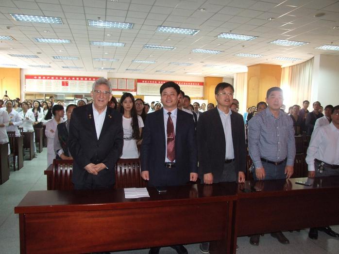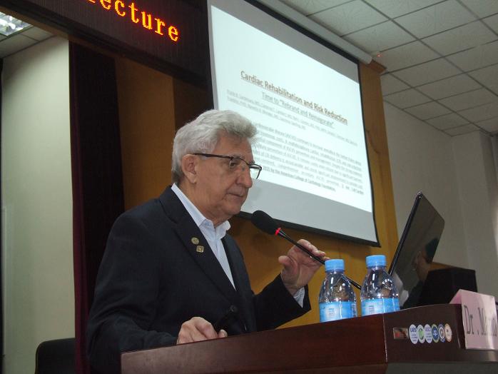 上午十点,Mario博士还在医院门诊十楼大会议室进行了题为《心脏病的康复及预防》的学术讲座,医院二百余名临床医务人员聆听了此次讲座。Mario博士给大家带来了美国、欧洲等地的医学领域在心脏病学方面的最新的研究成果,分析了心脏疾病的成因与相关影响因素,与大家分享了多年来在心脏康复领域的宝贵经验。他还通过大量的临床研究,证实了“通过保持健康的饮食习惯、合理的运动、戒烟等健康的生活方式”是预防和降低心脏病风险最有效的途径。Mario博士还强调,现在心脏病的治疗已经进入了“多学科联合作战”的时代,我们临床医务工作者应结合患者的生理状态和心理状态,请心理科医生协同会诊和治疗,以求达到更好的治疗效果。