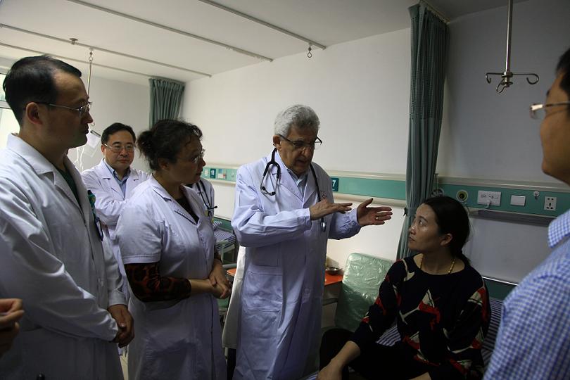 10月24日,心内科14床的郭大爷怎么都没想到,今天来给自己检查的专家是一位“洋医生”。郭大爷高兴地说:“外国的专家来查房,真洋气!”