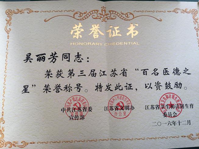 我院大急救中心主任兼重症医学科主任吴丽芳荣获第三届江苏省“百名医德之星称号
