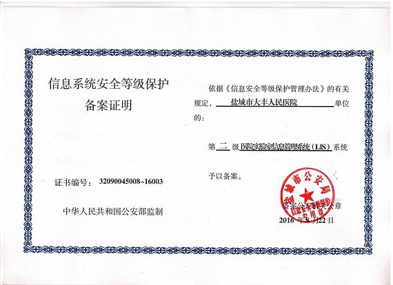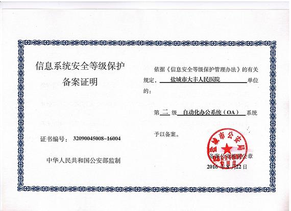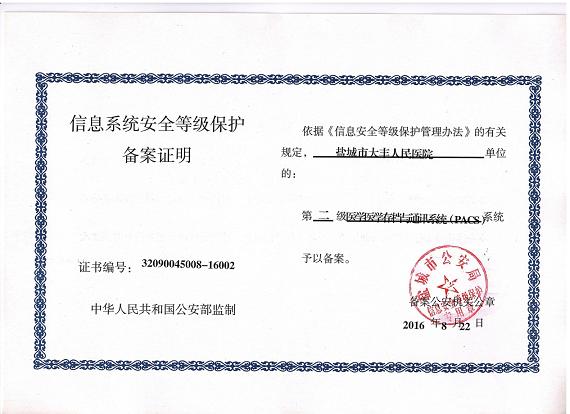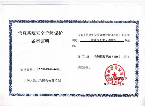 管理出质量,管理出成果,今年二月底公安部终于审核通过了我院申请的信息系统安全等级保护(二级)备案,这意味着,我们医院的信息化系统已经达到了创建三级医院的“加强信息系统的安全保障和患者隐私保护”条款的A类标准,为三级医院创建工作打下了良好的基础。