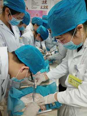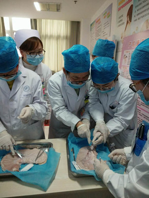 3月27日,产科宣教室热闹非凡,一场别开生面的操作技能实训正如火如荼地进行中。这次实训,我们采用直观的教学方法,通过猪肚模拟女性子宫及会阴部,在各位主任、副主任医师及高年资带教老师的指导下,实行一对一、手把手的教学与指导:从切皮到切口分层次缝合,从切口的长短、到缝合的深浅度及对称性、解剖层次、如何打结、如何抓握持针器及持物镊等方面都进行了逐一的指导及模拟训练。