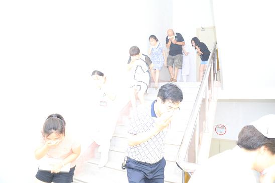 演练开始后,按照设定的程序,八楼护理部办公室发生火情,情况紧急,发现人员按应急上报机制立即使用就近的消防器材进行灭火,同时启动手动报警,大声呼叫本科室其他工作人员支援灭火。消防控制室接报警后上报总值班,总值班接“报火警”上报应急总指挥部。总指挥按内部应急报警机制和外部应急报警机制向院部通报,启动《火灾应急及疏散预案》,各应急小组进入应急状态,带齐预备物资迅速赶到火警现场,利用室内消火栓、灭火器等消防器材对火灾进行控制,同时立即组织、指导人员快速有序地撤离到安全区域,几分钟后,人员全部疏散完毕,演练活动结束。