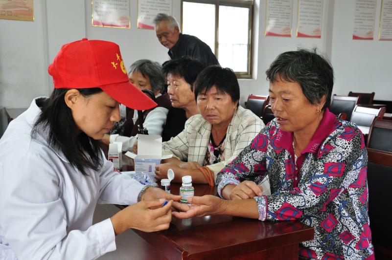 志愿者为前来体检的村民测血糖