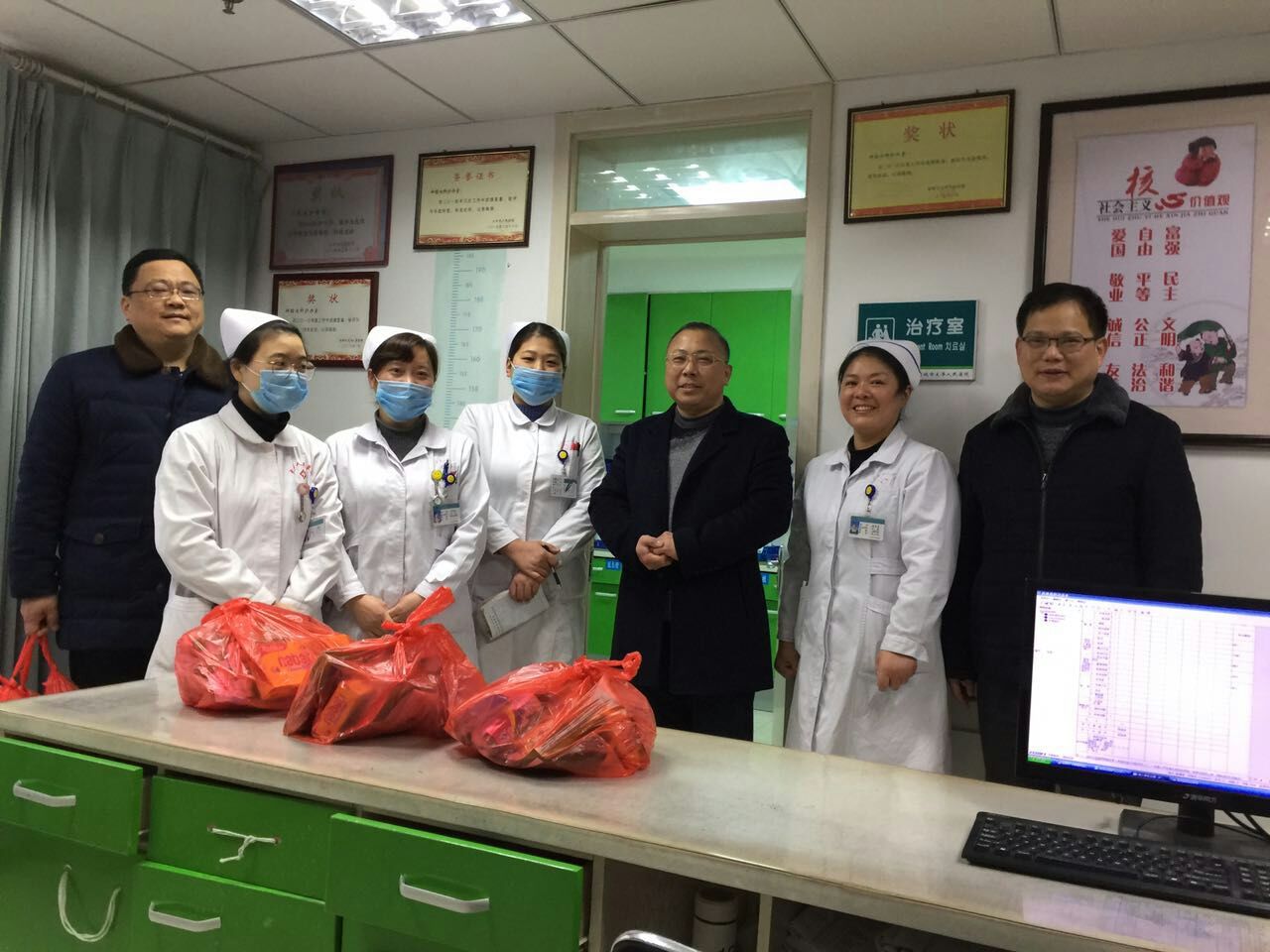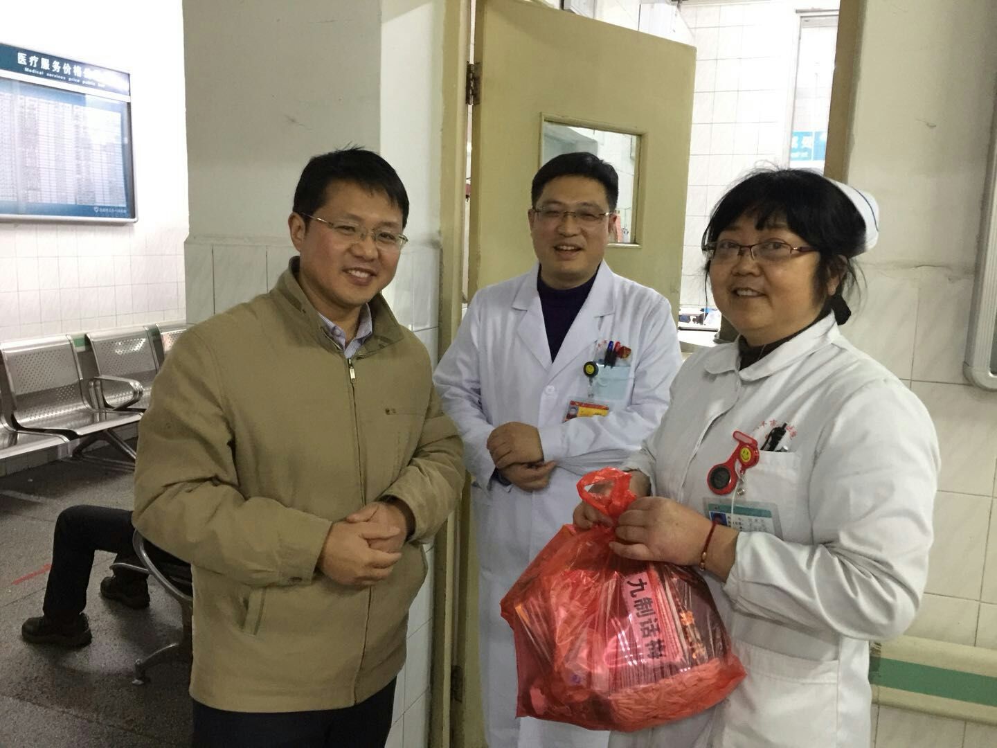下午5:00,医院党委书记、院长柏正群带领全体领导班子成员及相关职能科室负责人分赴住院部、急诊等一线部门,亲切看望慰问了值守一线的临床、医技、后勤职工,为他们送上诚挚的新年祝福。每到一处,院领导与坚守岗位的职工亲切握手交谈,并送上慰问品,感谢他们为医院的发展、为患者的健康辛勤工作所做出的奉献,向他们表达敬意,致以节日的问候。院领导对坚守一线职工表示亲切问候的同时,还详细了解各个病区留院病人的病情状况,询问节日期间的排班情况,并要求医护人员要注重医疗安全,提高服务质量,保证医疗秩序安全、有序。