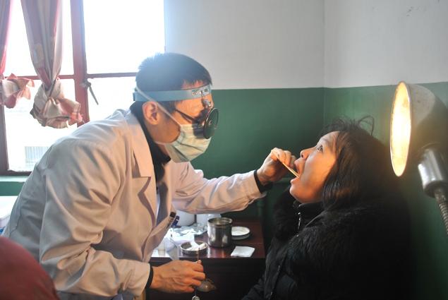 耳鼻咽喉科副主任医师刘建兵在为前来就诊的病患检查身体