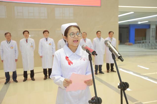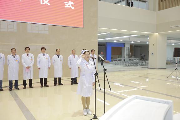 在庄严的国歌声中,鲜艳的五星红旗冉冉升起。国旗迎风招展,国旗下,身着护士服、头顶燕帽的护理人员在护理部主任沈冬梅的带领下重温了南丁格尔誓言。