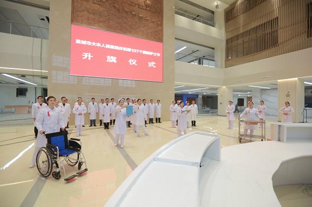 为纪念第107个国际护士节,传承南丁格尔精神,弘扬护理文化,5月12日清晨,大丰人民医院在幸福路新院区举行了“庆祝‘5.12’国际护士节升旗仪式。