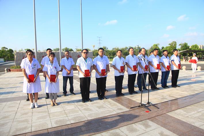 清晨7时,迎着朝阳,庄严的升旗仪式在幸福院区的广场上隆重举行。鲜艳的五星红旗伴随着《义勇军进行曲》缓缓升起,两边的红十字会会旗与丰医集团会旗也随之冉冉升起。升旗仪式结束后。来自各科的新入职医生在庄严的国旗下举起右手郑重宣誓:“我接受崇高的医师职称,从事神圣的医疗职业,我庄严地宣誓,我忠诚于医疗卫生事业,决心为人类的身心健康、防病治病、救死扶伤,贡献我全部的知识力量。我要刻苦钻研医学科学技术,开拓新的知识领域,做人类健康的卫士。我要发扬社会主义的人道主义精神,继承祖国优良的医德传统,忠于职守,廉洁行医,不谋私利,不做危害病人和社会的事情。我要尽心竭力爱护病人,不分国籍种族信仰身份地位,都给予真诚的平等医疗服务。我要尊重同行,互相学习,团结合作,维护集体荣誉,绝不恶意中伤、诽谤、破坏同行的声誉。”铿锵的宣誓声久久回响在院区上空,他们表示将不忘初心,满怀热情,在以后的医疗工作中奉献自己的力量。