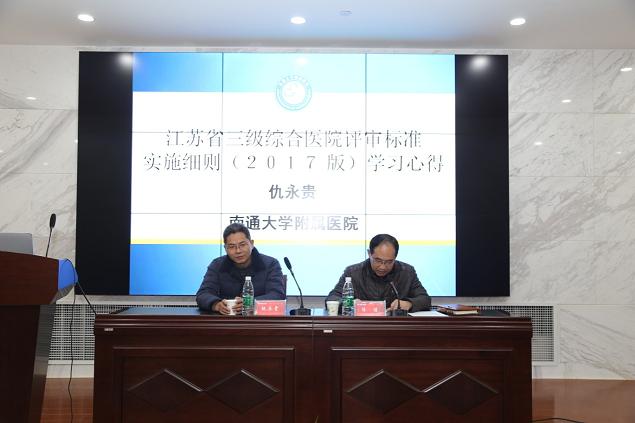 为了使全院干部职工进一步理解等级医院评审标准,掌握评审的要点和方法,持续推进三级医院创建工作,3月6日,我院邀请南通大学附属医院门诊部主任、等级医院迎评办主任仇永贵来院进行专题辅导。院领导、中层干部及各科室创建工作联络员等200余人参加了培训。