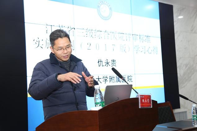 培训会上,仇永贵主任从《江苏省三级综合医院评审标准实施细则(2017版)》主要内容、主要变化、迎评工作的准备、最新评审规定的衔接四个方面进行了详实的解读。他指出,等级医院评审需提供的材料种类繁多,数量较大,涉及到医院各科室各部门,是对医院硬件和内涵建设的一次全面检阅,硬件达标不代表软件达标,软件达标不代表水平达标,水平达标不代表评审能通过。创建“三级”医院是一个系统工程,是全员性的工作,人人都是评审对象,事事都是评审重点,务必高度重视,全身心的付出。要统一理念、统一组织、统一落实、统一检查、统一整改;要摒弃形式主义,真抓实干,实事求是;要注重管理方法与管理工具的应用,最后仇永贵主任用短短的三句话诠释了创建工作的内涵:写你要做的!做你所写的!记你所做的!