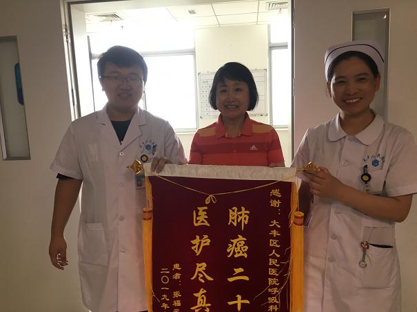 患者张某某20年前确诊肺癌后一直在我院呼吸内科治疗,经过多次放化疗,肿瘤得到控制。今年患者因为呼吸衰竭再次收住我院呼吸科。入院时,患者病情危急,情绪急躁,曾几度陷入昏迷。医嘱病危,经过长期积极的治疗和医护人员悉心的照料,病情逐步平稳脱离了危险。患者大女儿送锦旗时对单国琴护士长解释道,锦旗上的十个字,她们姐妹七人斟酌了很久,她们认为要不是呼吸内科,父亲得了肺癌是不可能活到现在,而科室里每一位医生和护士总是精心的对其进行照顾,对父亲和她们提出的意见总是认真听取、仔细分析,提出的要求更是尽量满足,尽心尽力!不愧“医护尽真情”这五个字!