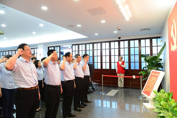上午九时,大巴缓缓驶进上海市兴业路76号,中共一大会址在细雨中显得尤为庄严肃穆。一入馆,首先展现在眼前的是壮观的人物浮雕和鲜红的党旗,前来参观的全体党员站在党旗前举起右拳,再次郑重宣誓:“我志愿加入中国共产党,拥护党的纲领,遵守党的章程……”铿锵有力的宣誓,句句响亮。随后,大家登上二楼展厅,瞻仰建党时的珍贵文物展品,缅怀中共“一大”代表生平,重温我们党诞生的故事。