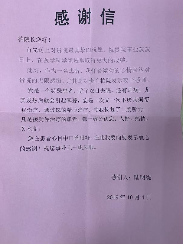 8日上午,正在上专家门诊的柏正群院长被前来就诊的人群团团围住,走近一看,原来是来自新东苑小区的陆大妈在向周围的人讲述她的就医经历,几年的耳疾在柏院长的精心治疗下得到了意想不到的疗效,今天特地送锦旗和感谢信,以此来表达对柏正群院长及医院的深深感激之情。感谢信作为最传统的表达感谢的方式,在通讯手段高度发达的今天,依旧散发着独特的魅力,洋溢着医患深情。这封感谢信不仅是对柏正群院长的肯定,更是对医院今后工作的一种鼓舞,彰显了医患之间的真诚与和谐!