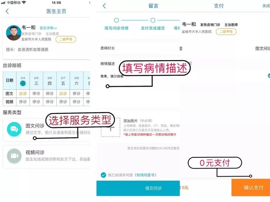 尽可能详细的填写病情描述—支付费用(0元)后,即可进行咨询诊察。