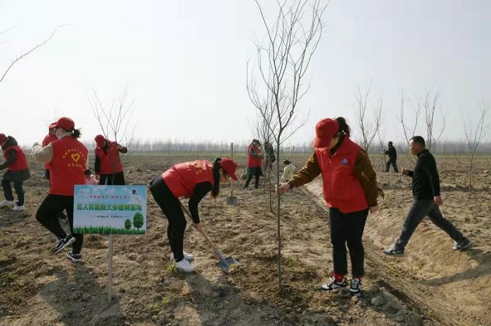 热情高涨的活动现场,志愿者们分工协作、密切配合,各个环节衔接有序,有的挥锹挖坑、有的扶树填土、有的夯实土层......经过大家近一个小时的共同努力,102棵承载着绿色希望的榔榆树苗被栽种下。