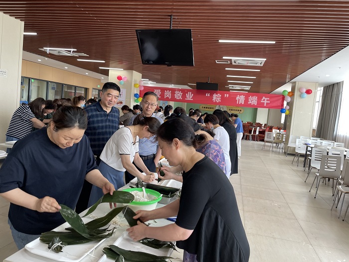在端午佳节临近之际,为传承中华传统文化,纪念中国伟大的浪漫主义诗人屈原,积极弘扬爱国精神,同时丰富职工的文化生活,缓解工作压力,愉悦身心,增进广大职工之间的沟通与友谊。6月11日下午,医院工会组织全院职工在食堂餐厅开展了“永远跟党走·我们的节日——庆端午·包粽子”比赛活动。医院党委书记张袁丰、工会主席顾伟出席了本次活动。