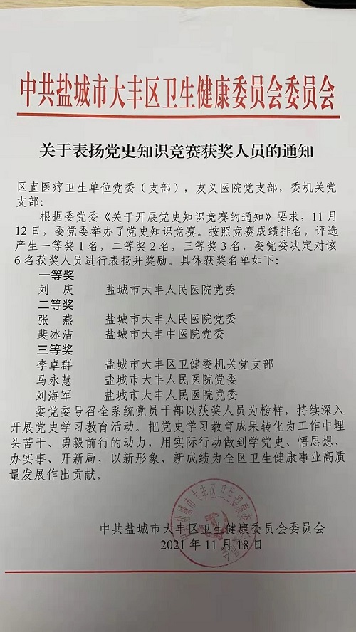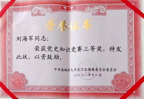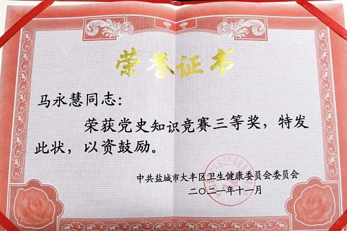 我院选手在区卫健委党史知识竞赛中喜获佳绩 来源:本站原创 作者:佚名 发布时间:2021/12/01 点击数: 次 【字体:小 大】 为扎实推进党史学习教育向纵深发展,区卫健委近期组织开展了党史知识竞赛。 竞赛以中国共产党党史、新中国史、改革开放史、社会主义发展史为主要内容,以单选、多选、问答的形式形成竞赛题,来自区直各医疗卫生单位党(委)支部、友义医院党支部、卫健委机关党支部等党组织的38名党员代表进行了激烈角逐。我院选手在竞赛中获得佳绩,其中刘庆、张燕、马永慧、刘海军分别荣获竞赛的一、二、三等奖。 分享到: 【打印正文】