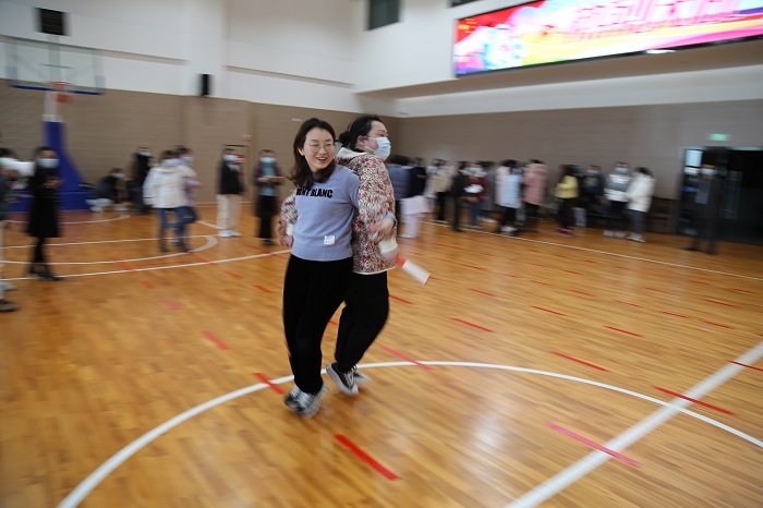 赛场上,大家既兴奋又紧张,个个都卯足了劲,争当前列。八人组团队中,每组两名队员面向跑道,背靠着背,挽住手臂,在起点线成半站半蹲跳状态,手拿接力棒蓄势待发;一听到“哨令”,立即出发,每组运动员都拼尽全力,相互配合,如矫兔般腾挪跳跃,敏捷异常,在大家的呐喊、欢呼声中,个个都想能尽快冲到终点。有的小组配合默契,动作顺畅,眼看着离终点越来越近;有的小组明显磨合不够,两个人的动作不在一个节拍上,没跳几步就翻倒在地,又立即起来继续,引得在场临时组合的“啦啦队员”们的阵阵笑声,那激动的心情,胜利的喜悦,在到达终点后的瞬间迸发出来,场上充满欢声笑语......大家通过活动放松了心情、愉悦了身心,更增进了彼此的情谊,体会到了团队协作的快乐氛围。